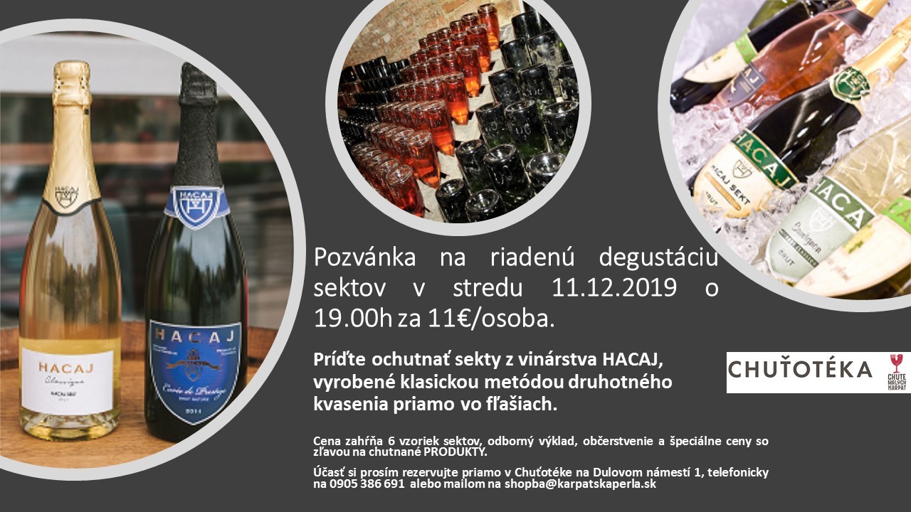 Pozvánka na riadenú ochutnávku sektov z vinárstva HACAJ, ktoré boli vyrobené klasickou metódou druhotného kvasenia priamo vo fľašiach.