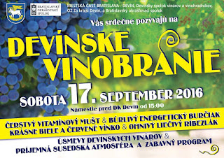 Pozvánka na Devínske vinobranie, ktoré sa uskutoční 17.9.2016 na námestí pred Domom kultúry Devín. Samozrejmosťou budú prešovaný mušt, burčiak, ríbezlák devínskych vinárov a vínka zo sútaže „Devínsky strapec“. Viac info v letáku.