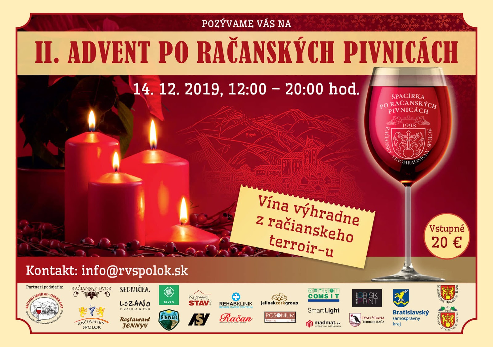 Vstupné: 20€ (lístky sa objednávajú cez info@rvspolok.sk a kupujú v Račianskej Vinotéke a vo Vinárstve Miloš Máťuš)