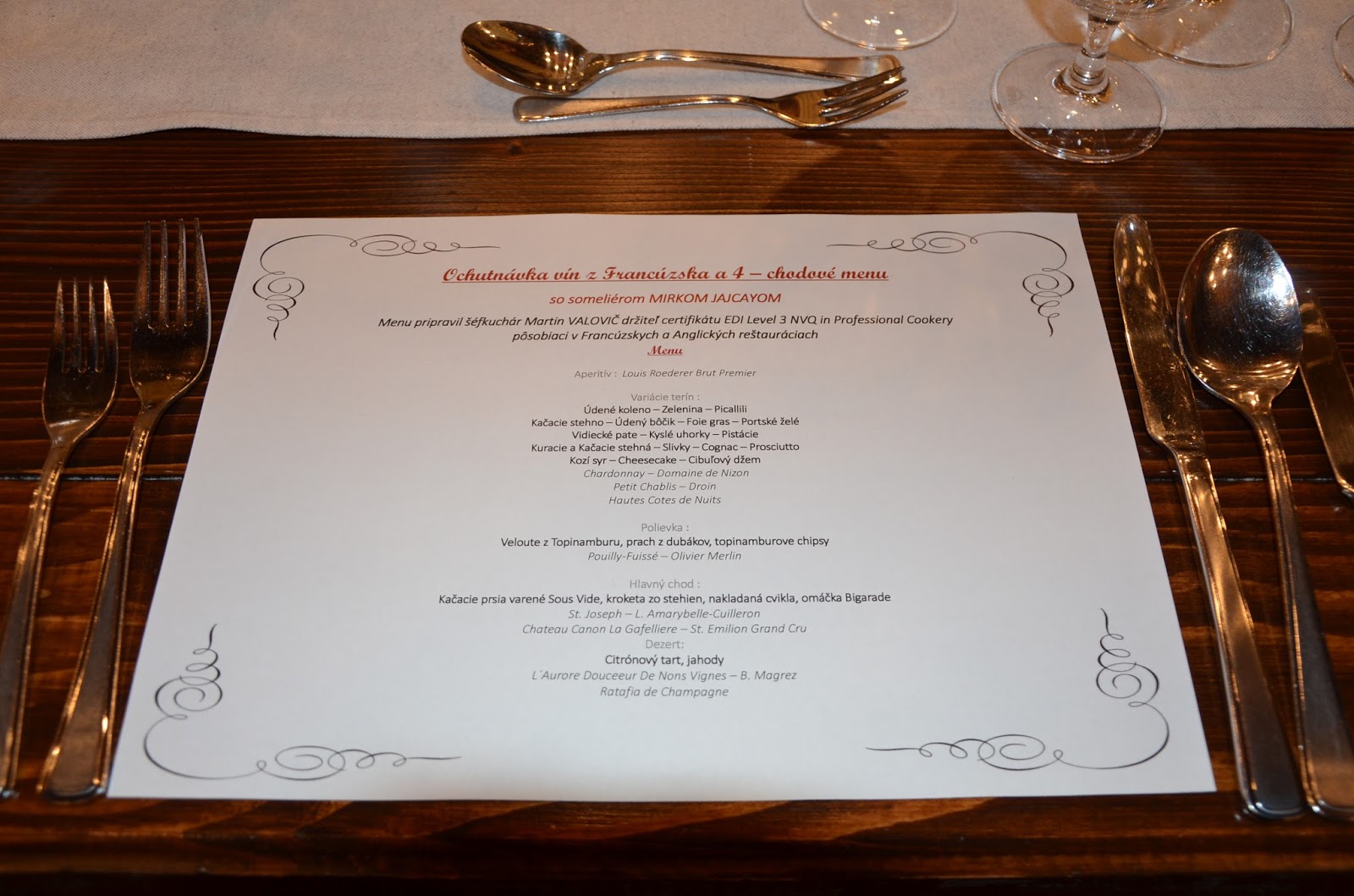 9. februára 2017 sme sa vybrali do reštaurácie penziónu KAROLÍNA v Slovenskom Grobe, pretože sme prijali pozvanie na degustačnú večeru zameranú na párovanie jedál a vín z Francúzska. Večerou nás sprevádzal známy somelier a odborník na francúzske vína - Miroslav JAJCAY, ktorého dopĺňal tvorca degustačného menu - šéfkuchár Martin VALOVIČ (držiteľ certifikátu EDI Level 3 NVQ in Professional Cookery, pôsobiaci v reštauráciách vo Francúzsku a Anglicku).