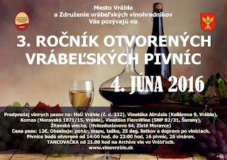 Pozvánka na OTVORENÉ VRÁBEĽSKÉ PIVNICE, ktoré sa budú konať v sobotu 4. júna 2016. Zúčastní sa ich 26 vinárov a navštíviť môžete 16 pivníc. Začína sa o 14:00 na Archíve vín, kde si budete môcť kúpiť lístky za 12,- €. Dostanete vlastný pohár, mapu, tašku a 25 degustačných lístkov. Po viniciach bude zadarmo premávať kyvadlová doprava po vyznačenej trase. Na záver programu bude tancovačka na Archíve vín.
