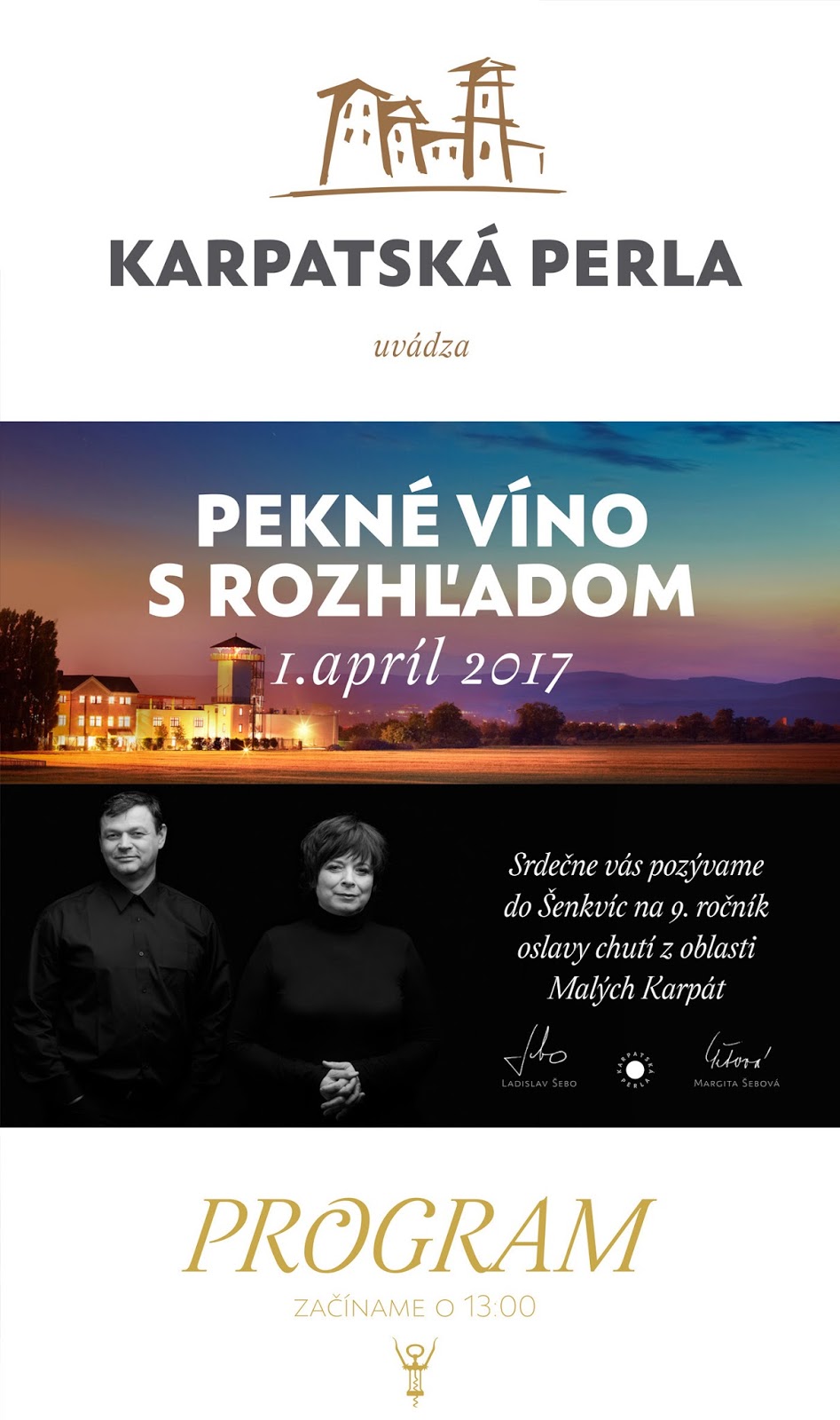 Pozvánka na 9. ročník podujatia Pekné víno s rozhľadom. Uskutoční sa 1. apríla od 13:00 do 20:00 hod. v KARPATSKEJ PERLE. Aj tento rok sa môžete okrem ochutnávky vín tešiť na bohatý sprievodný program. Už od 13:00 si môžu všetci športovci zmerať sily v súťaži v behu na rozhľadňu. Veľkú pivnicu ozdobia diela maliarky Dany Polákovej. V tančiarni vás roztancuje hudobná skupina Reset.